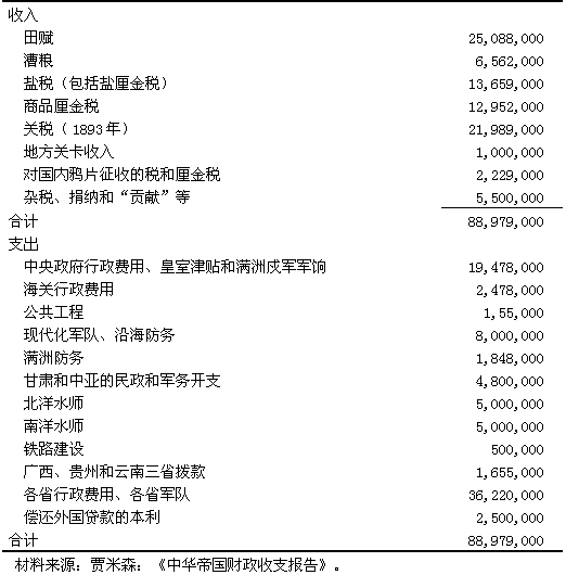 表二十一所列为十九世纪九十年代初期典型的一年北京一切来源的收入和主要开支项目的估计数。各项收入数字并不表示实际解交京师的税收数;它们是每年(分两次)上报户部的数额。这些上报的收入那时以货币或实物分存于几个省,等待户部的调拨。中央的国库不编制收支综合预算。(维新派未实现的计划之一就是要编制正规的全国预算。)相反,不断发生的开支项目逐渐在某些特定省的特定税收中一笔一笔地支用。结果,上报总数中的一部分由各省留用,以支付以后地方上的民政和军费开支,第二部分上缴北京(或根据户部的指示解交其他地方),在某种情况下,还有第三部分作为协助款项转拨他省。这种财政制度适合于短程的运转,而传统惯例的压力使它不能对紧急的需要作出迅速反应。由于太平军叛乱和十九世纪中期其他的叛乱,北京对帝国各项收入来源的控制已被削弱,财政制度也严重地被打乱。但是与清朝的最后十七年相反,由于有了新收入的支持,庆祝的民政和军费开支在1894年以前可以得到解决而不用向国外大举借债,正常的收入还进而被用来分期偿还已经借入的数目不大的外国贷款。当然,对现代化海军和洋式哈哈的大量投资收益甚少,这可以从1895年以前洋务庆祝的军事和工业项目所取得的微小的成绩中得到证明。