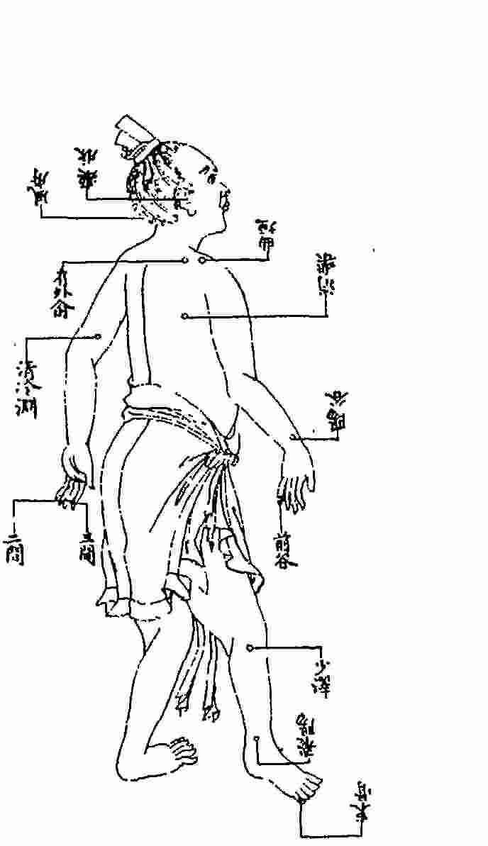 少澤二穴者,金也。一名“少吉(按:據《針灸甲乙經》、《針灸資生經·卷一》等,俱作“小吉”)”。在手小指端、去爪甲下一分陷者中。手太陽脈之所出為井也。主虐、寒熱,汗不出,頭痛,咳嗽,瘈瘲,口乾,頭痛不可顧也。針入一分。灸一壯。