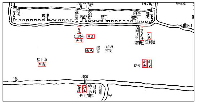 大统寺在景明寺西,即所谓利民里。寺南有三公令史高显洛宅。每夜见赤光行於堂前,如此者非一。向光明所掘地丈馀得黄金百斤,铭云:"苏秦家金,得者为吾造功德。"显洛遂造招福寺。人谓此地是苏秦旧宅,当时元义秉政,闻其得金,就洛索之,以二十斤与之。衒之按:苏秦时未有佛法,功德者不必是寺,应是碑铭之类,颂其声迹也。东有秦太上公二寺,在景明南一里。西寺,太后所立;东寺,皇姨所建,并为父追福,因以名之。时人号为双女寺。并门邻洛水,林木扶疏,布叶垂阴。各有五层浮图一所,高五十丈,素采布工,比於景明。至於六斋,常有中黄门一人,监护僧舍,衬施供具,诸寺莫及焉。